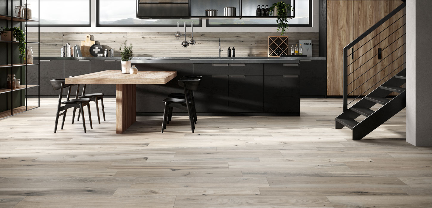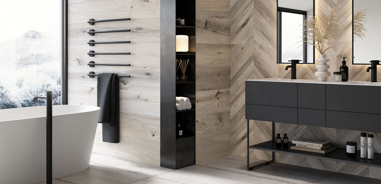 Die Antique Wood Serie imitiert gekonnt die Farben und Struktur von gealtertem Holz. Diese Fliese gibt es für den Innen- und den Außenbereich und ergänzt modernes ebenso wie klassisches Design.