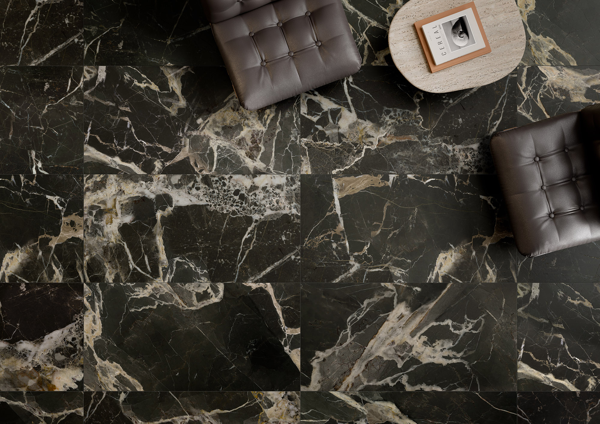 Die Black Gold Marmor-Effekt Feinsteinzeug-Serie ist die perfekte Wahl für diejenigen, die ein Design mit großer Wirkung suchen. Das tiefschwarze Finish wird elegant unterbrochen von glitzernden goldenen Adern und zarten weißen Quarzstreifen, was einen außergewöhnlichen Kontrast schafft und eine elegante Erklärung von Raffinesse ausdrückt.