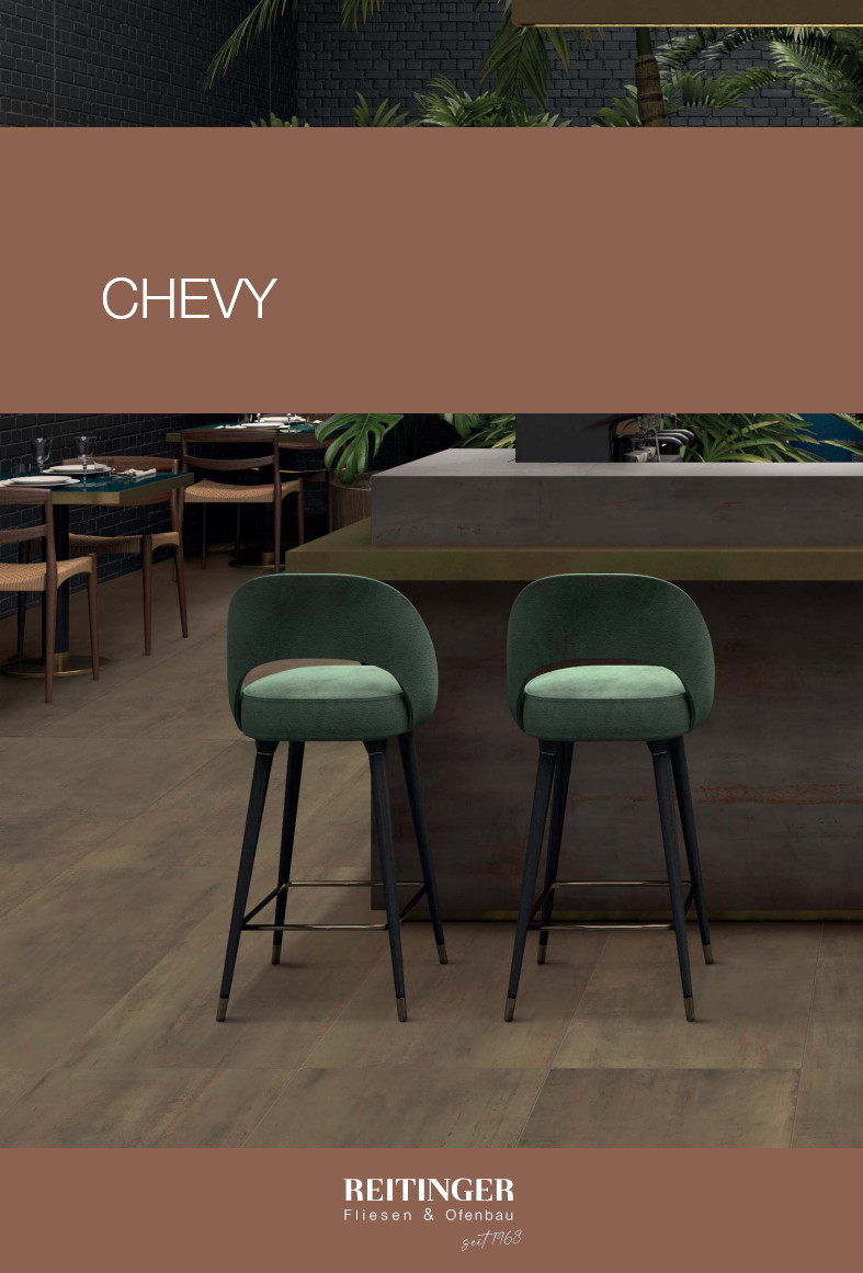 Eine faszinierende Oberfläche mit durchscheinenden Effekten und angenehmen Farbkontrasten, die bei der Abnutzung entstehen, um mit Rändern und Rostspuren den Zauber eines gealterten Materials wiederzugeben: Das sind die Wesensmerkmale von Chevy, der Kollektion aus Steinzeug, die die Essenz der oxidierten Metalle in 7 Farbtöne neu interpretiert, um interessante Farbspiele zu präsentieren. Die Kollektion weist ein breites Angebot an Formaten und Stärken auf und reicht von 6 mm starken Platten im Großformat 160x320 cm bis hin zu Platten 90x90 cm in der Extrastärke 20 mm mit Grip R11 für Außenräume.