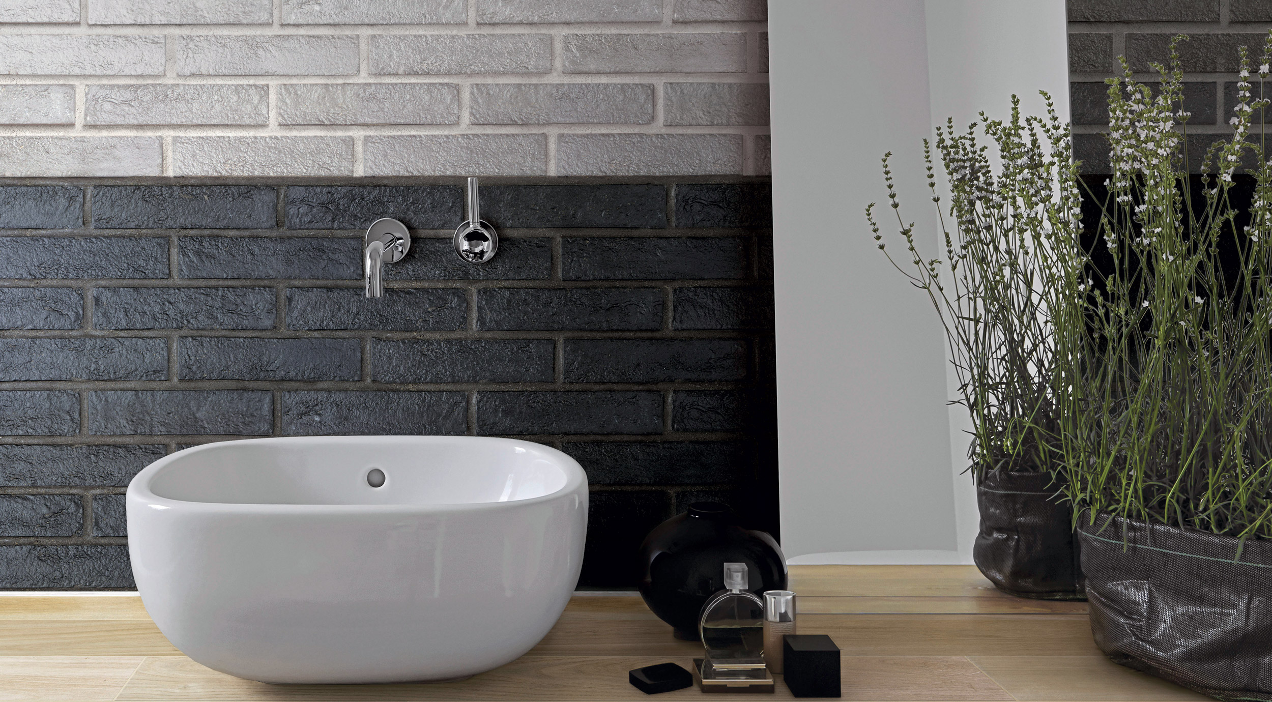 Klassische Farben - white, almond, black und grey - entdecken dank einer Keramikoberfläche mit einer matten, gipsartigen Wirkung, die in allem den eleganten Fassaden von Brooklyn Heights oder den Stadtvierteln der auf der Upper East Side zu bewundernden raffinierteren Brownstones ähnelt, neue Aktualität und ästhetische Wirkung.